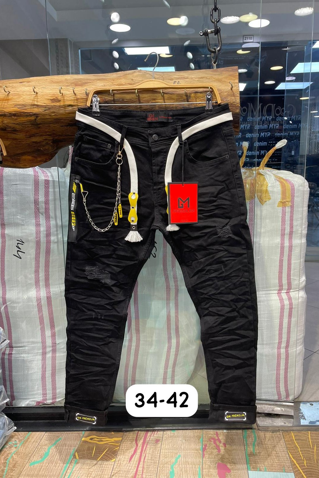 Blugi barbati cu rupturi. Material elastic, croiala slim, accesoriu inclus. Banda de jos se poate intoarce sa ramana cu tiv normal.
