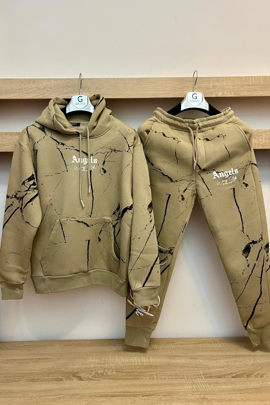 Trening barbati. Bluza stil hanorac cu gluga, banda elastica in talie si la maneci. Pantaloni conici, banda elastica in talie si la glezna.