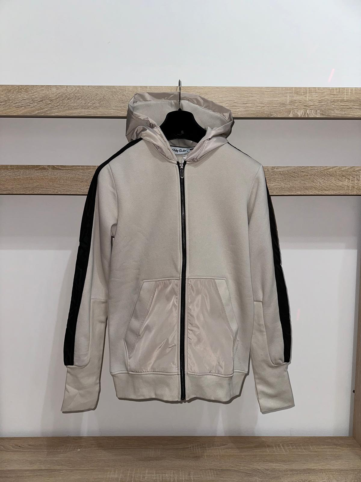 Trening barbati. Bluza cu închidere pe fermoar, gluga, banda elastica in talie si la maneci. Pantaloni conici cu buzunare laterale, banda elastica in talie si la glezna.
