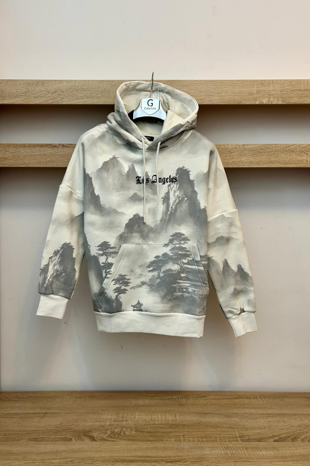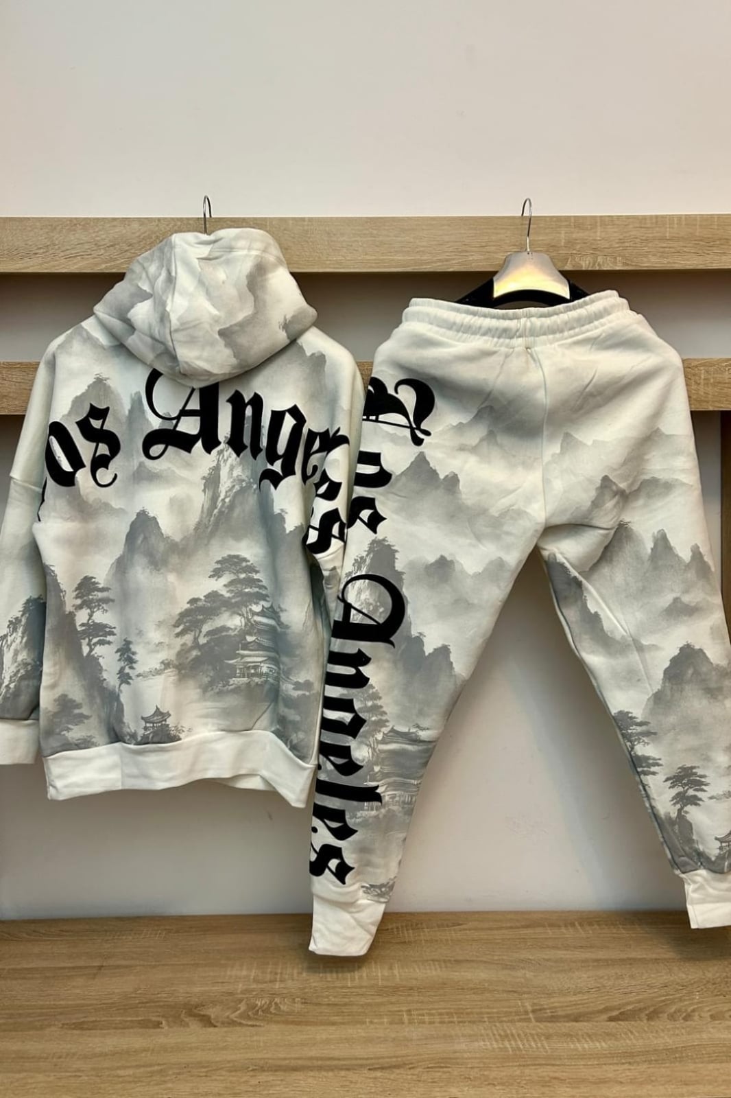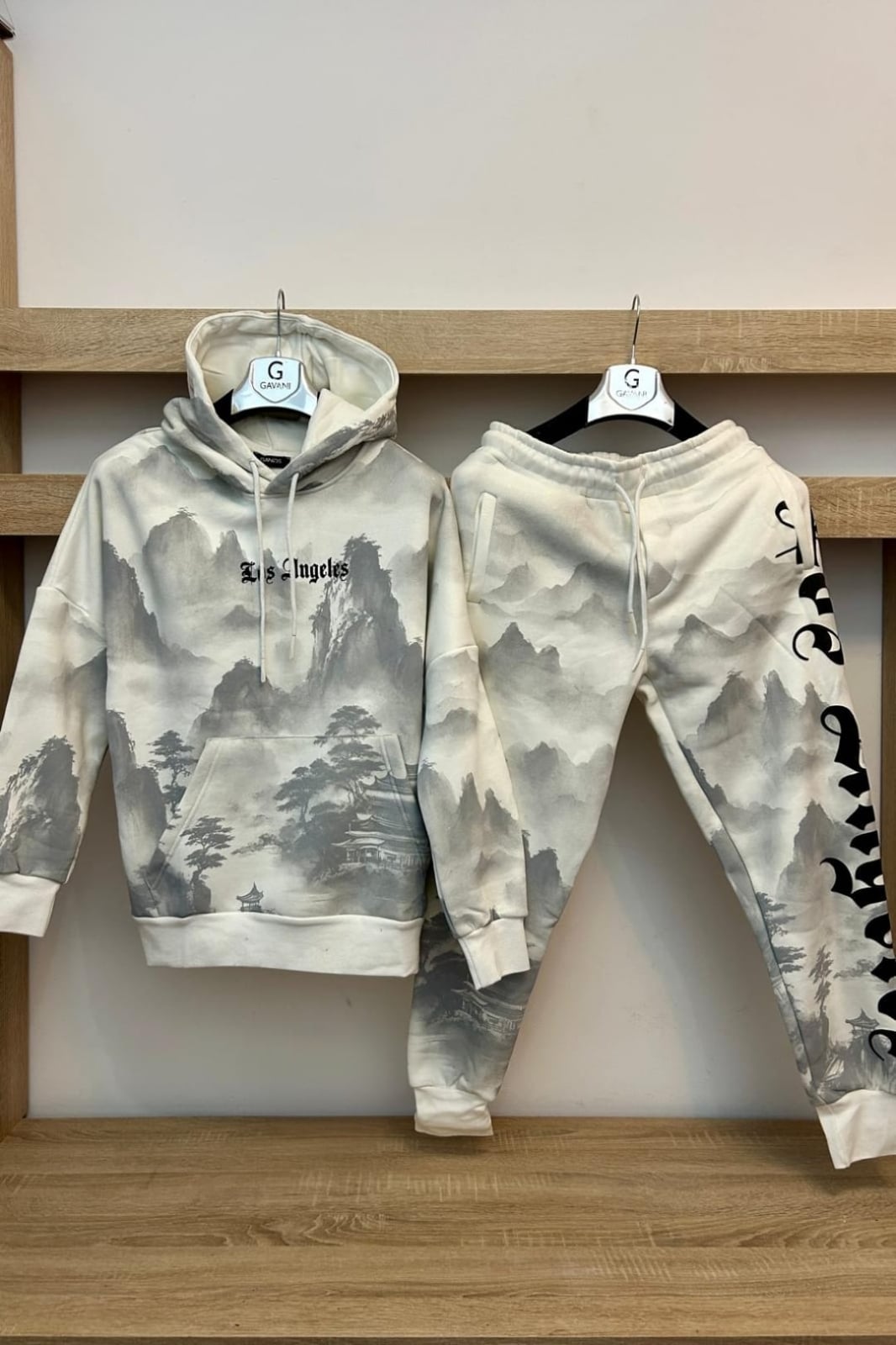 Trening barbati. Bluza stil hanorac cu gluga, banda elastica in talie si la maneci. Pantaloni conici, banda elastica in talie si la glezna.