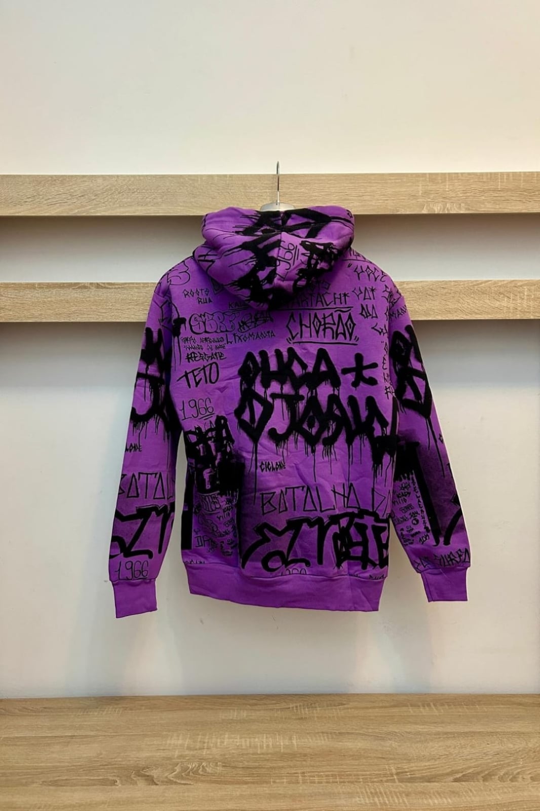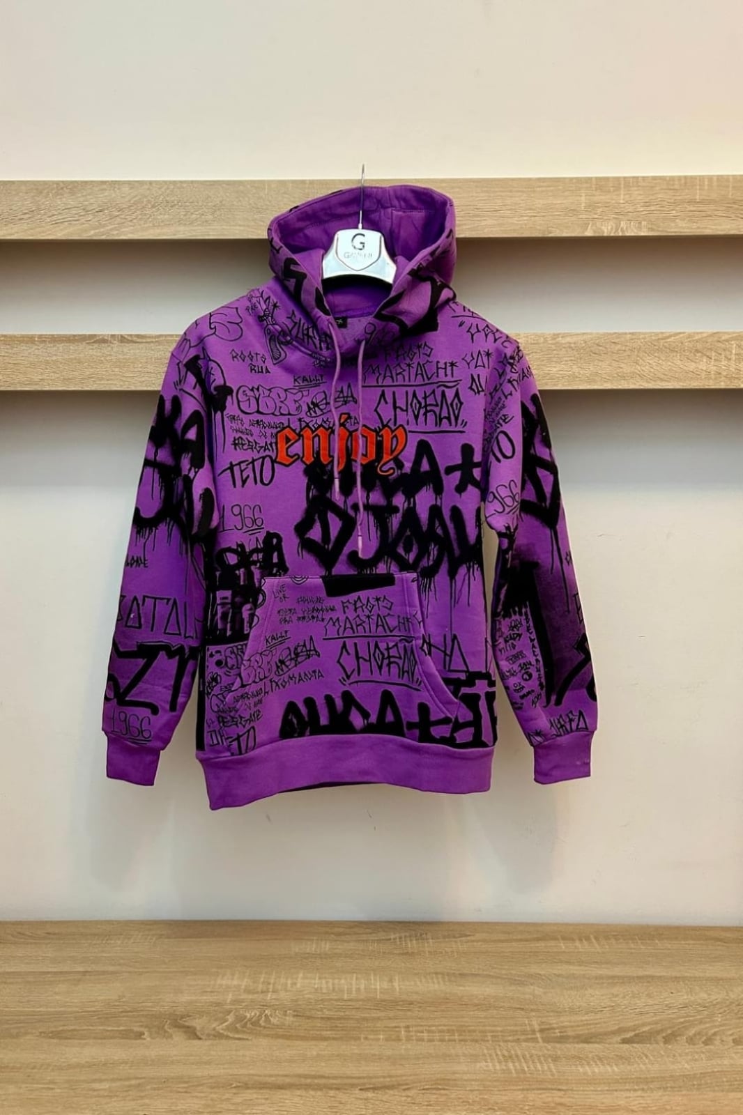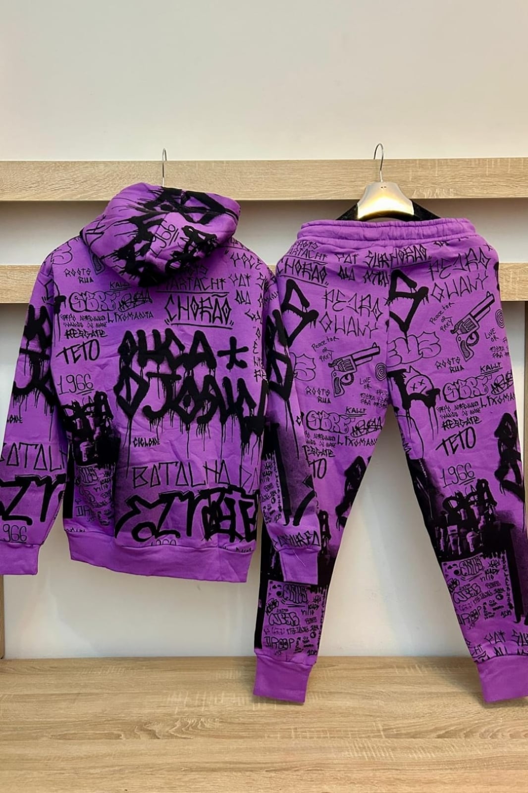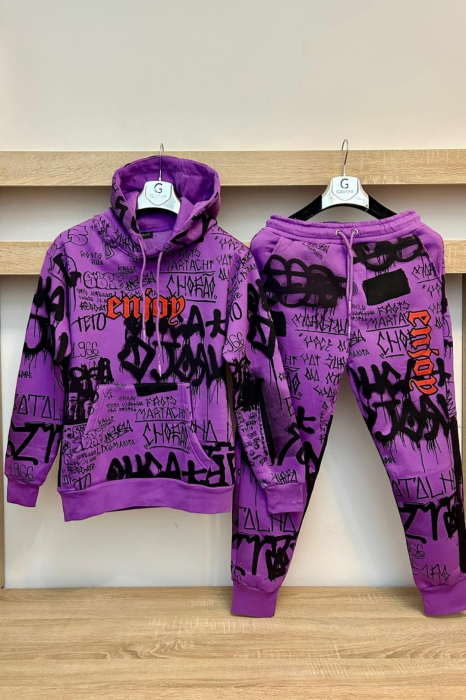 Trening barbati. Bluza stil hanorac cu gluga, banda elastica in talie si la maneci. Pantaloni conici, banda elastica in talie si la glezna.