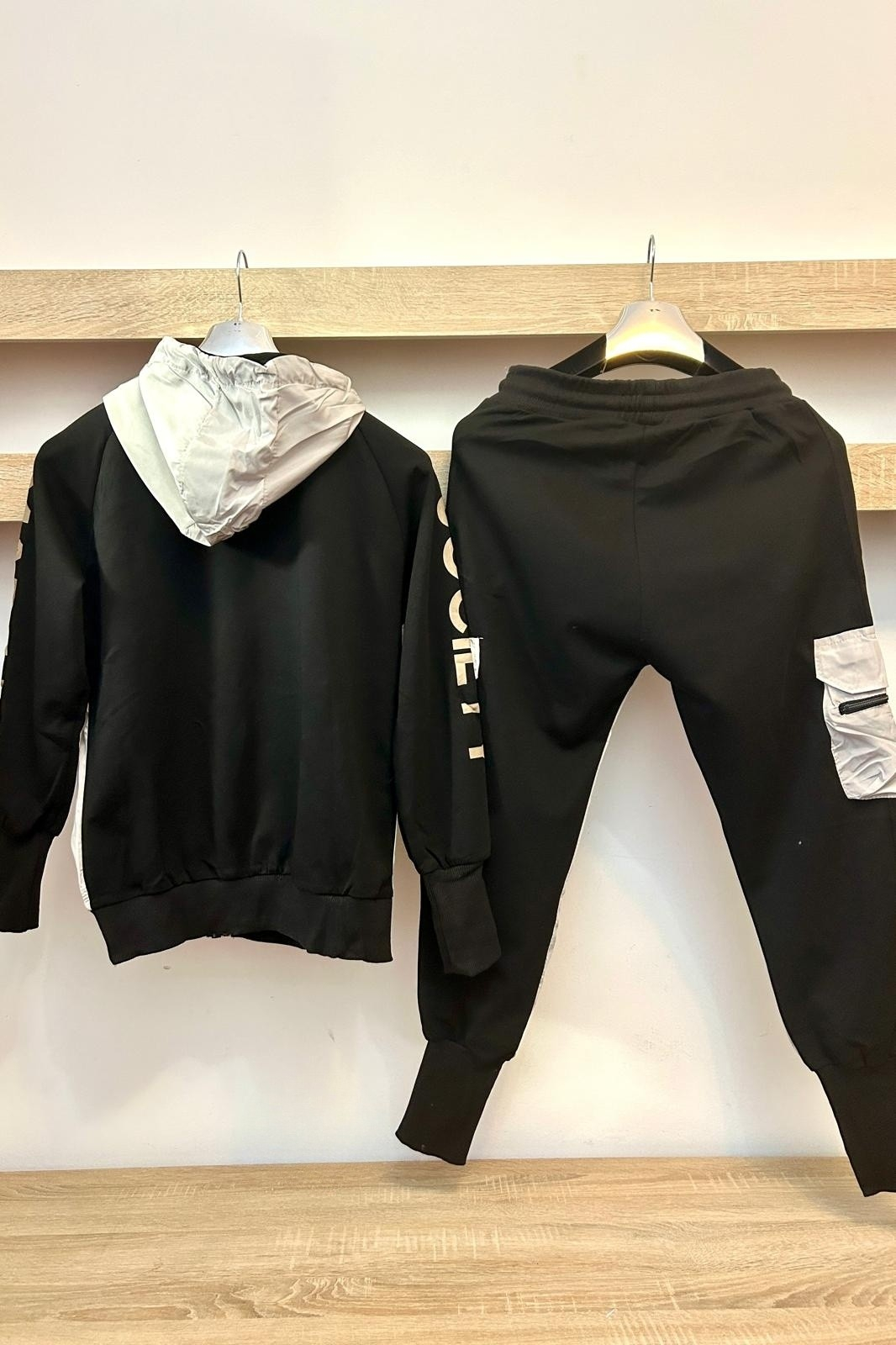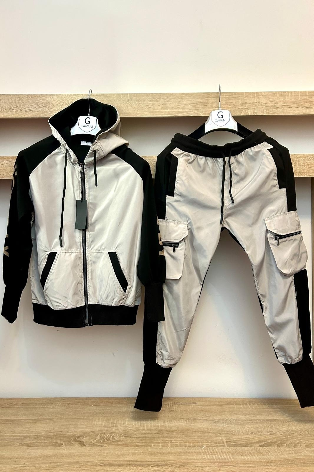 Trening barbati. Bluza cu închidere pe fermoar, gluga, banda elastica in talie si la maneci. Pantaloni conici, buzunare laterale cu fermoras.
