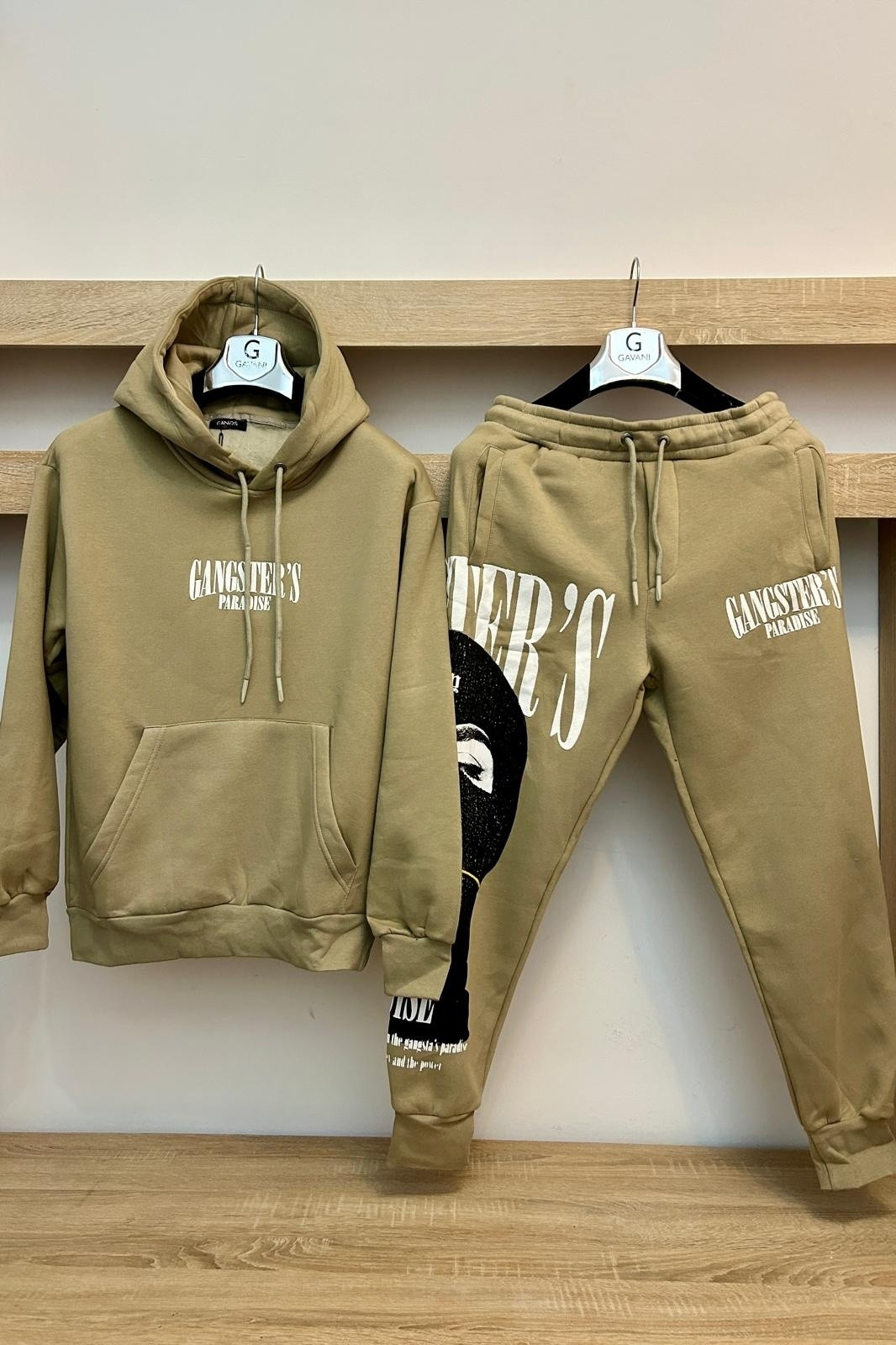 Trening barbati. Bluza stil hanorac cu gluga, banda elastica in talie si la maneci. Pantaloni conici, banda elastica in talie si la glezna.