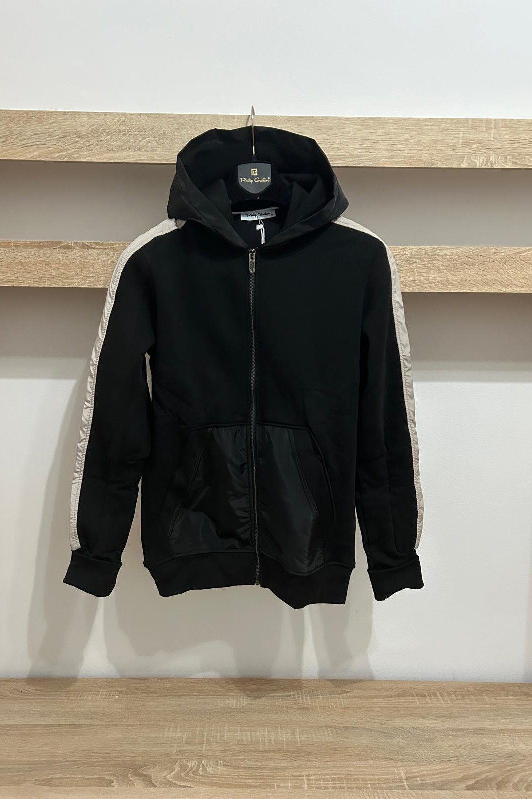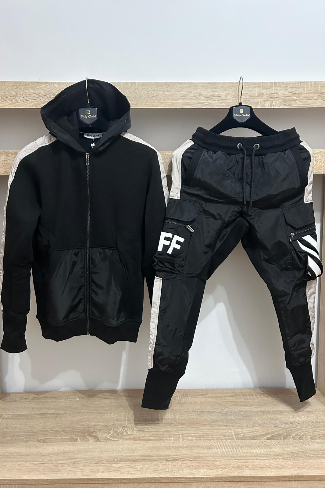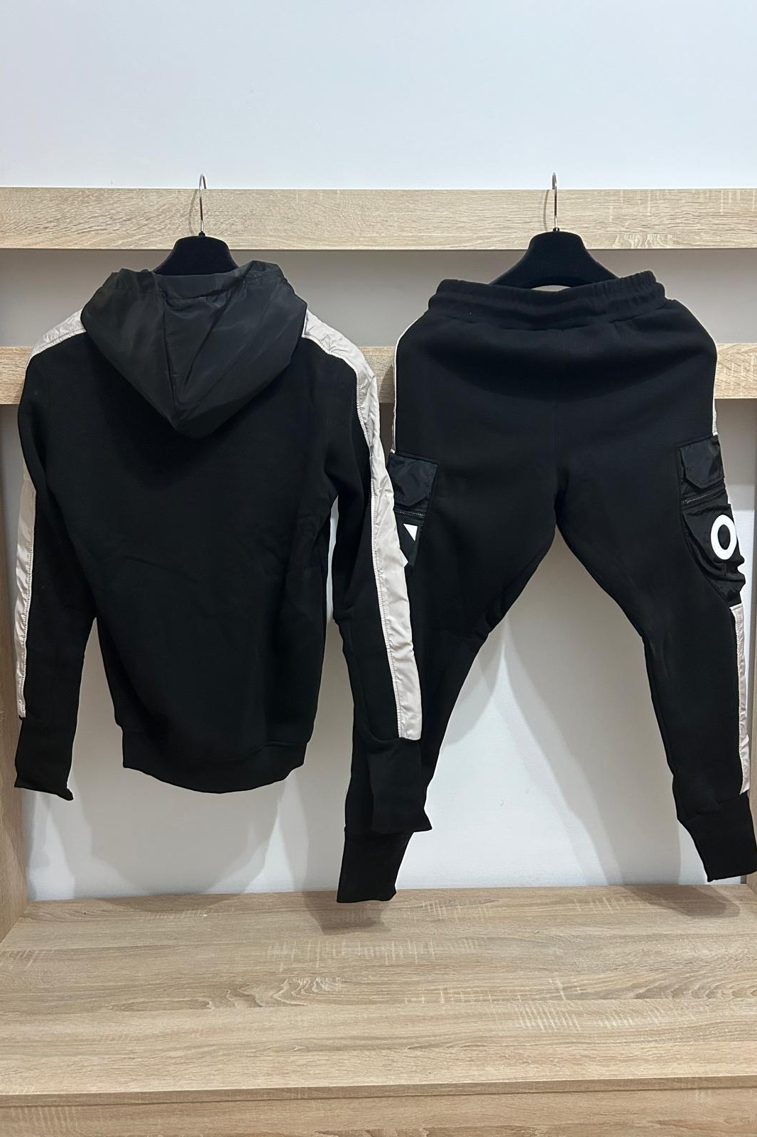 Trening barbati. Bluza cu închidere pe fermoar, gluga, banda elastica in talie si la maneci. Pantaloni conici cu buzunare laterale, banda elastica in talie si la glezna.