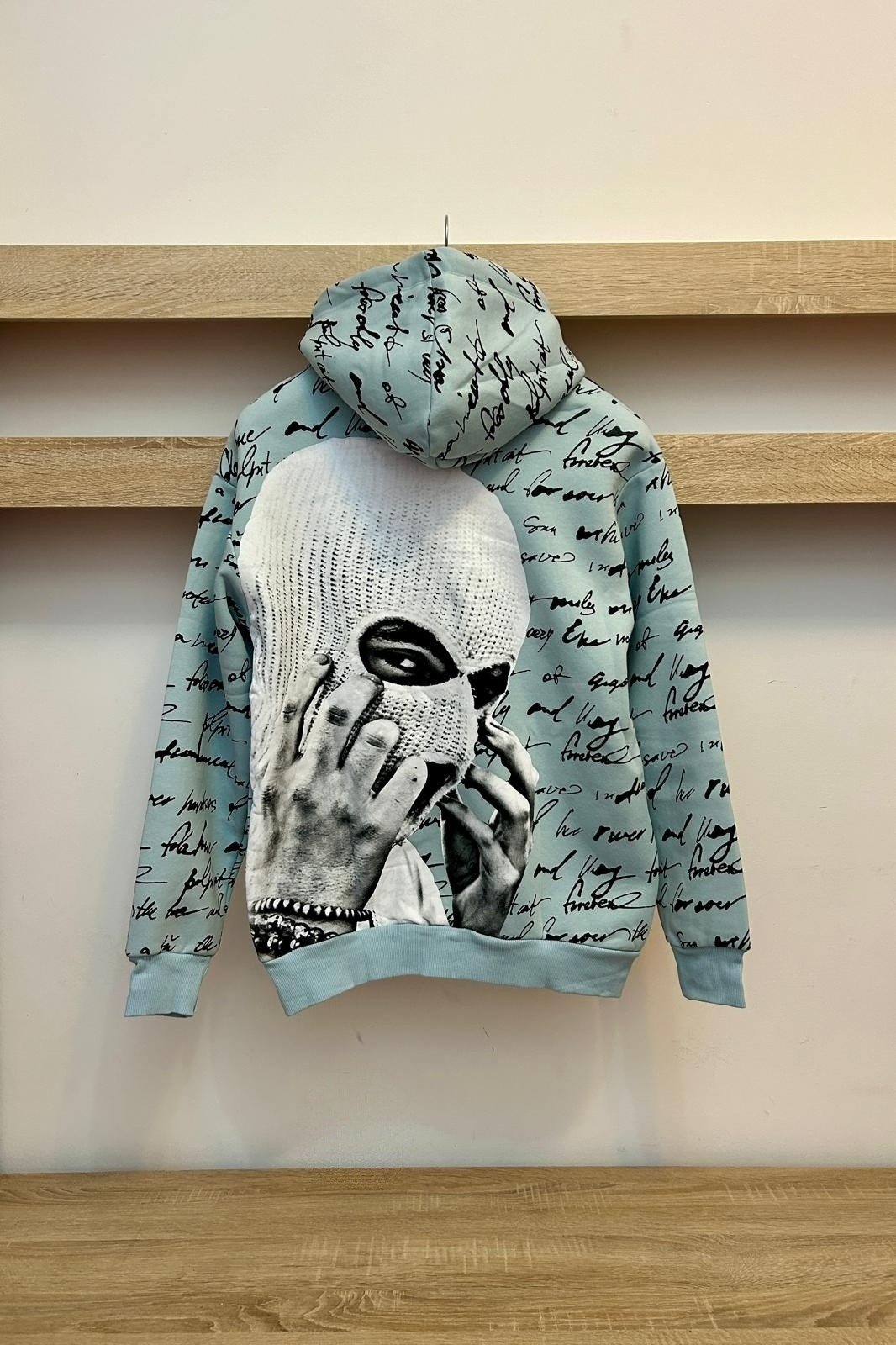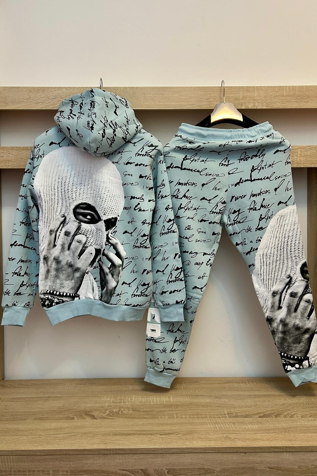 Trening barbati. Bluza stil hanorac cu gluga, banda elastica in talie si la maneci. Pantaloni conici, banda elastica in talie si la glezna.